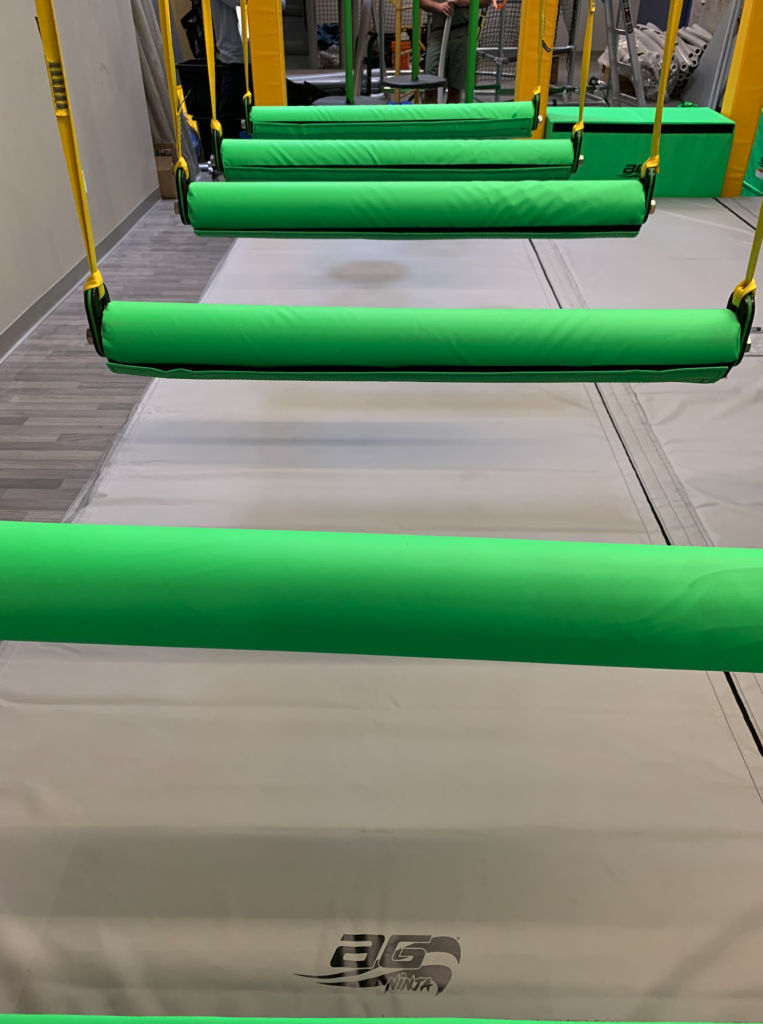 The idea behind the Ninja course was to provide something a broad age range of kids can play on or create a timed obstacle course. The obstacles included were all considered fairly low level but tons of fu. We jazzed up the space by doing a sharp looking color scheme of green, yellow and grey.