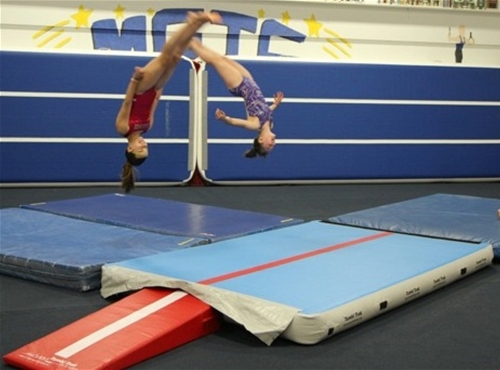 Each unit includes an electric pump, a carrying bag and a Velcro flap to connect two or more units end-to-end to create longer tumbling strips. The Air Floor Pro has a center line which can be used as a visual aid for tumbling. 3M units include D-rings to easily attach the unit between uneven bars, along with a numbered center line.