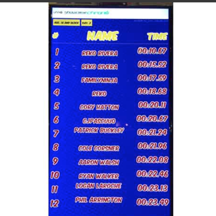 Timer Display (keeps best time ever, best time that day, and current participant’s time),