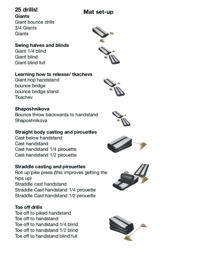The Golden Incline Bar Training System combines the benefits of some of the most common training equipment in the gym, such as the Tumbl Trak Bounce Bar, Handstand Trainer, Octagons, Skill Cushions and Incline Mats, into one simplified and condensed training package. The system includes:
