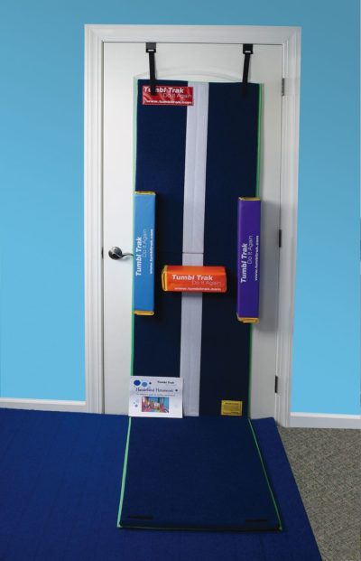 The Handstand Homework Mat is reversible. One side is a Cartwheel Mat (available in 4 colors) and the other side is blue carpet which features a 6ft. long, 4in. wide white “beam” stripe. The Mat is designed to easily attach to any door with slide-on clips and Velcro straps, but can also be used on the floor.