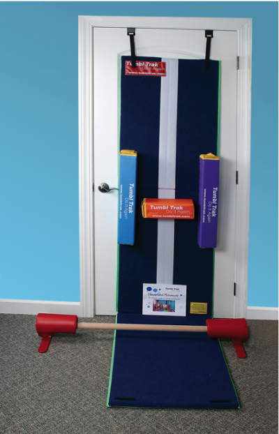 The Handstand Homework Mat is reversible. One side is a Cartwheel Mat (available in 4 colors) and the other side is blue carpet which features a 6ft. long, 4in. wide white “beam” stripe. The Mat is designed to easily attach to any door with slide-on clips and Velcro straps, but can also be used on the floor.