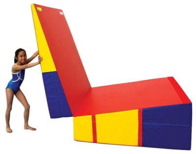 Deluxe Folding Incline Mats can do double duty as spotting blocks.  Foam Filler is prime 70 ILD polyurethane foam topped with a 1 3/8″ layer of crosslink polyethylene for firmer footing and to provide better “punch back” for handsprings, etc.. Covers are made of tough 18oz vinyl, the same vinyl that is used on our competition landing mats.