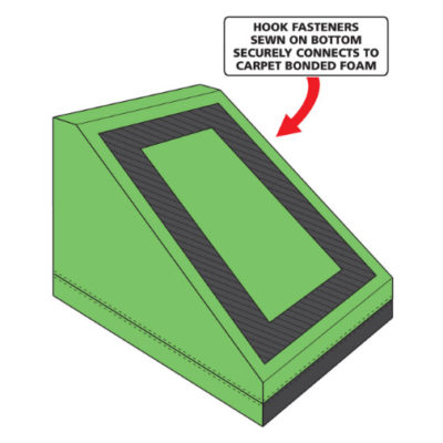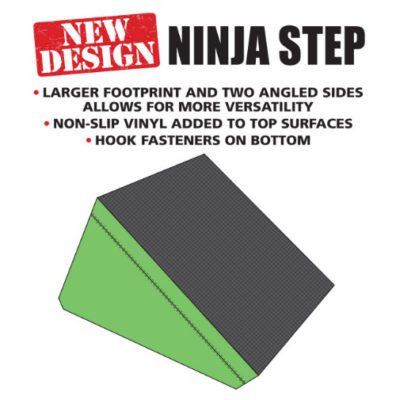 Please note that the design of our Ninja Steps has just been updated. The larger footprint and two angled sides allows for more variety and uses in the obstacle course. Our Diamond Grip non-slip vinyl has been added to top surfaces for improved foot traction and hook fastener sewn on the bottom of the steps securely connects them to carpet bonded foam.