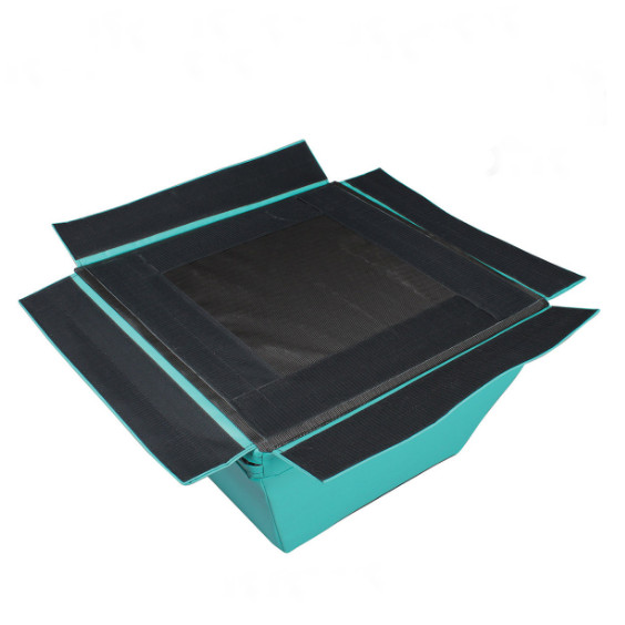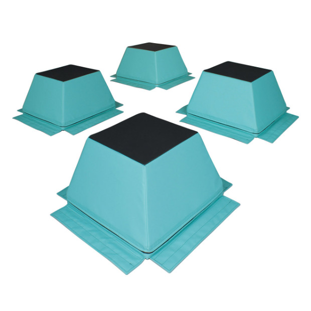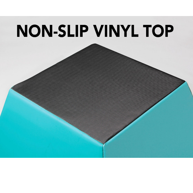Ninja Obstacle Course Posts have a 24″ x 24″ square base that tapers to an 18″ x 18″ top surface and are 14″ tall. Black non-slip vinyl on top with turquoise sides. All Ninja Obstacle Course obstacles securely attach to carpet bonded foam with strategically placed hook fastener flaps and strips. These posts have 4” strips of hook fastener permanently attached to the bottom plus 4 flaps with 4″ hook fastener. Covered with 18 oz. coated vinyl, stitched with Dacron thread and filled with polyurethane foam sandwiched between crosslink for optimal footing.