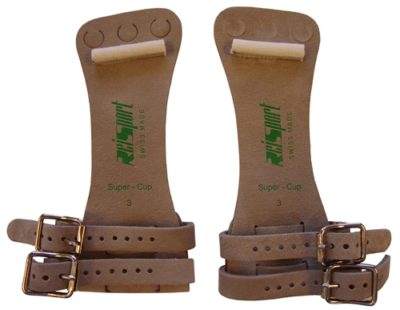 Three finger holes and a small rubber dowel high bar. Double buckle closure. Measure from base of palm to tip of longest finger.