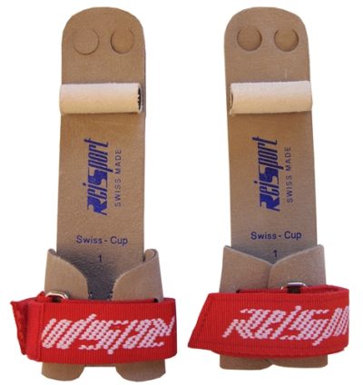 Two finger holes and a large rubber dowel for use on the rings. Hook and Loop wristband closure. Measure from base of palm to tip of longest finger.