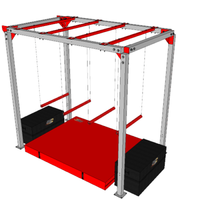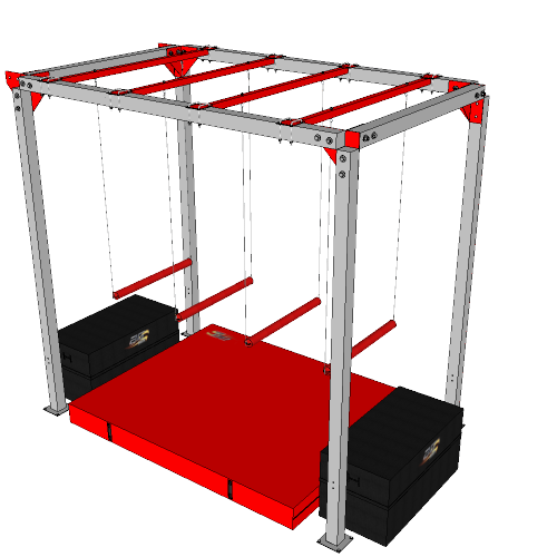 Participants grab the sides of the swing and then step from the platform to the first swing. Then by either generating momentum or simply reaching far enough they must grab onto the next swing and transfer their feet. Then repeat for each remaining swing until they reach the end. Requires combination of balance, lower body, and grip strength. The swing can be customized to any length desired but ag Ninja standard length is 3ft 4in. The swings are powder coated to the color of your choice and may be padded if desired. Rope/sling hardware and snap hooks are used to hang the obstacle from the Katana Frame crossbar.