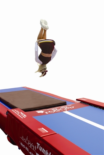 For “extreme” use, a layer of vinyl* is sewn to the top of the black tramp bed, adding durability. Clean, soft sole, indoor shoes can be used on this bed, making this a superb choice for Cheer gyms. The Xtreme Tumbl Trak™ bed also features a 4-inch wide white line down the middle to aid visualization while tumbling. Standard color is royal blue and red. Custom colors can be ordered at request (additional cost). All models ship via Motor Freight.